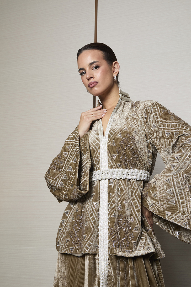 A structured velvet kaftan with embellished Aztec-inspired embroidery, Moroccan artisanal detailing, wide sleeves, and a braided metallic belt